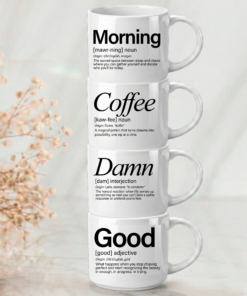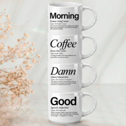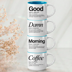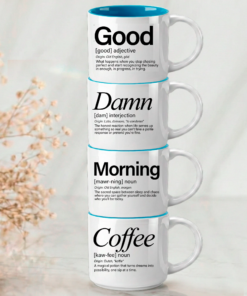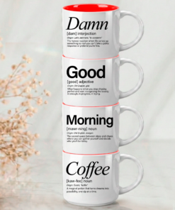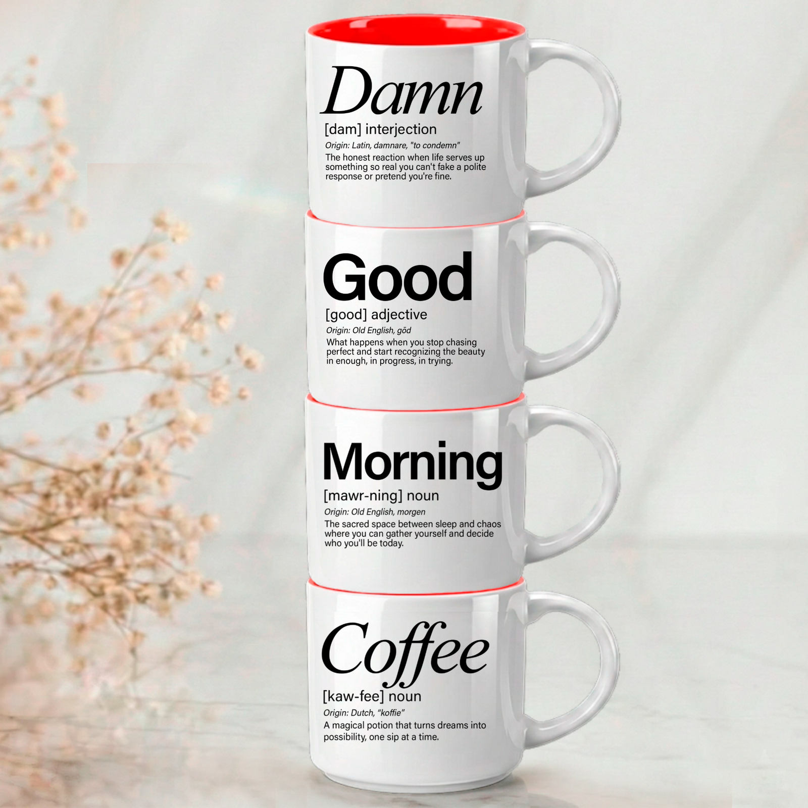 Damn + Good + Coffee + Morning – the complete coffee ritual captured in four stackable mugs.