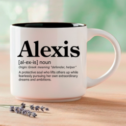 A name that means “defender” and “helper” — because Alexis stands up for what matters. From the Library of Names at Coffee & Words, this individual mug features three Word Story Style® definitions of Alexis — Meaningful, Whimsical, and Uncensored — printed on both sides of a premium 14oz ceramic mug with 4 interior color options.