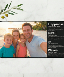 No stock photos or generic beach scenes. Just your memory, your chosen typography, and the reminder that happiness really does come in waves.