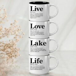 Four words that define lake life. The essential escape stack featuring blended Word Story Style® definitions printed on both sides of the mug so your story is always visible. Premium 14oz stackable mugs with 4 interior color options.