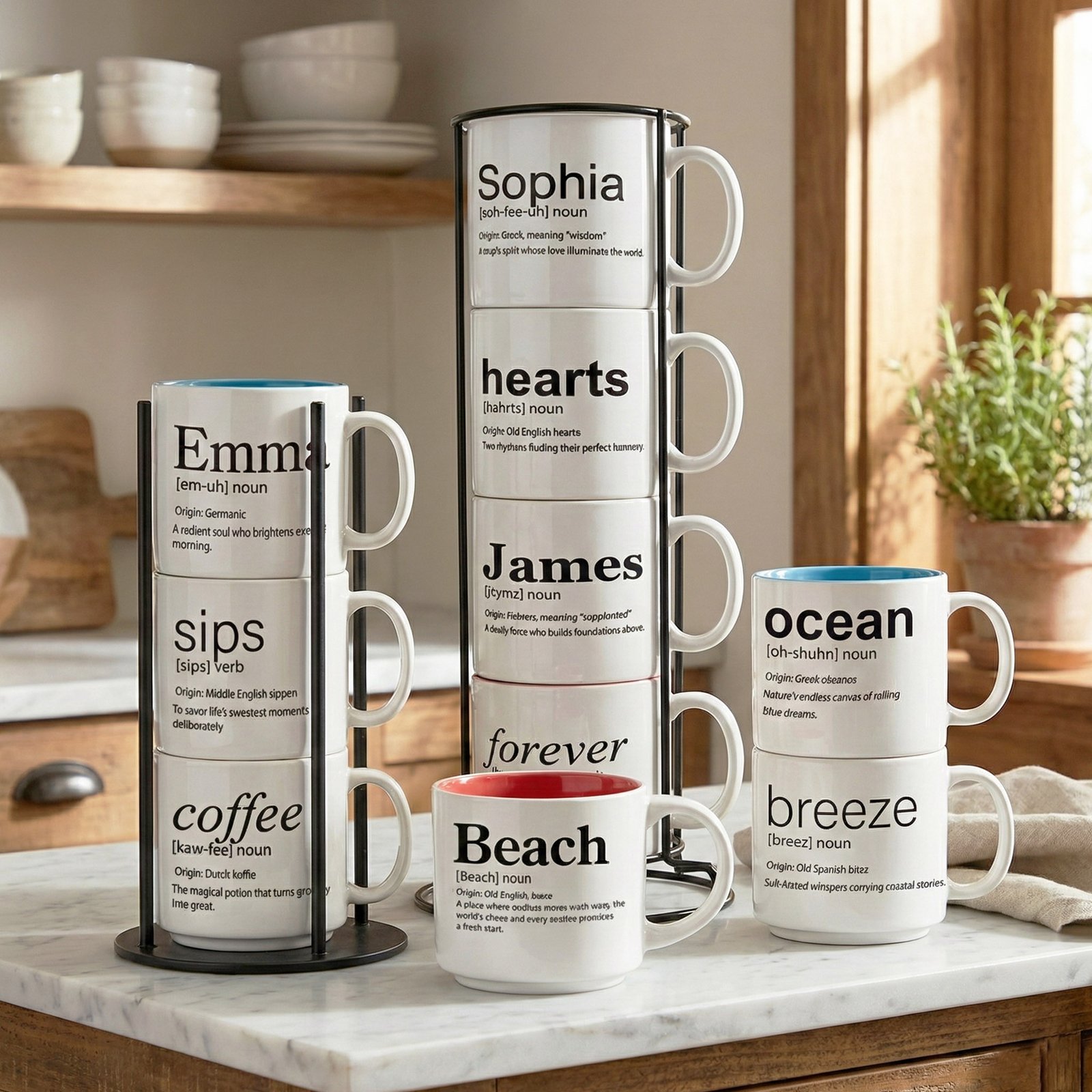 BUILD YOUR STORY: Every Coffee & Words mug stacks beautifully with others from the Library of Names and the Library of Words. Create your own meaningful combinations or add this word to an existing stack.