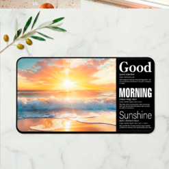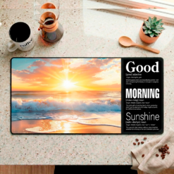 Story Stack Mat – The foundation for your coffee ritual or creative workspace. Breathtaking beach sunrises meet Word Story Style® definitions of “Good Morning Sunshine” on your choice of 12″ x 22″ (Coffee & Keyboard) or 16″ x 32″ (Barista & Full Desk Coverage) mat. Choose your sunrise mood and typography style.